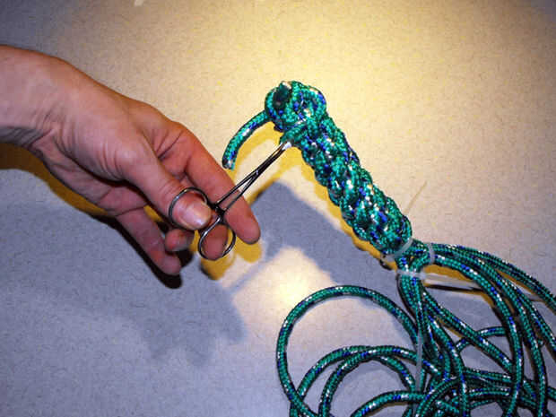 25. cola del gancho agarrador con alicates o pinzas hemostáticas y tire la cola a través del nudo existente