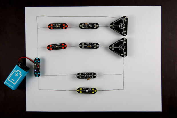 Encajar cada módulo en su correspondiente pie de impresión. Esta acción completa tu circuito! Asegúrese de que el módulo de batería y ambos interruptores están en la posición de apagado.