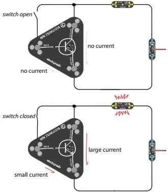 El transistor NPN es un amplificador de corriente. Pequeña corriente entre la base y el emisor se utiliza para controlar una corriente grande entre el colector y el emisor. Esto se muestra en el diagrama.