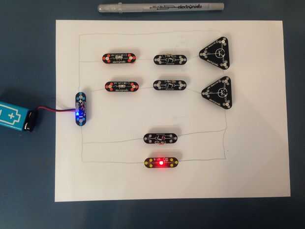 Queremos crear una situación en la que corriente fluye sólo a través del LED cuando ambos interruptores están encendidos. Para ello, conectamos el emisor de un transistor con el colector del otro.
