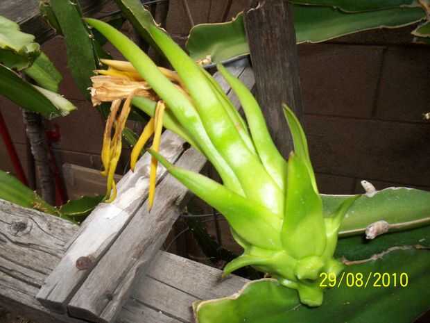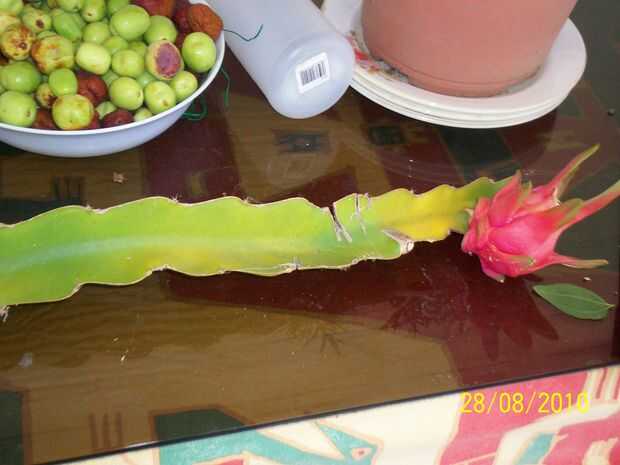 el fruto rosado es en realidad una pitahaya, 10 crecer cada año, el verde es un unripen uno y su son algunas manzanas miniatura raro, desde mi casa de verano ~ ~ ~ estos no eran tan difíciles de crecer, el árbol tomó un rato a gow (en lugar de semillas, mi mamá compró una versión del bebé de la misma, para evitar la molestia). Usted sólo puede comer lo que no está dentro de la pitahaya, la ' madre ' (puede probar pero no que bueno).