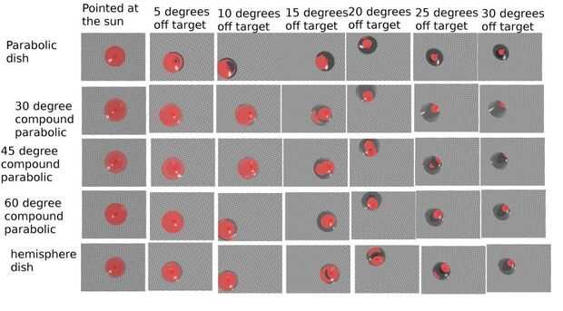 Explicación del cuadro. Con la sobrecarga de sol, todos los platos muestran una imagen completa roja, lo que significa que la luz del sol se verá todo reflejado a la bola roja en el foco! Así que son todas tan buenas cuando señaló el sol! 10 grados (40 minutos más tarde) un cresent negro aparece en la reflexión de plato parabólico lo que significa que este plato es mucho más pobre en esas condiciones. Refleja conciderablenent menos luz a la bola roja que hacen otros platos! De 30 grados de blanco, casi todos los platos son inútiles, el único rojo que podemos ver es la bola roja sí mismo. Los platos sólo reflejan la luz del sol hacia el espacio. (La gente de arte de la ilusión no es demasiado impresionada con mi mala elección de ampliación) etc.. Debo han tenido los discos rojo mucho más grandes. Lo siento
