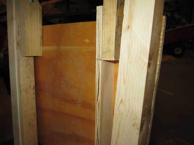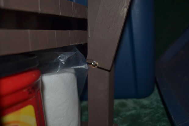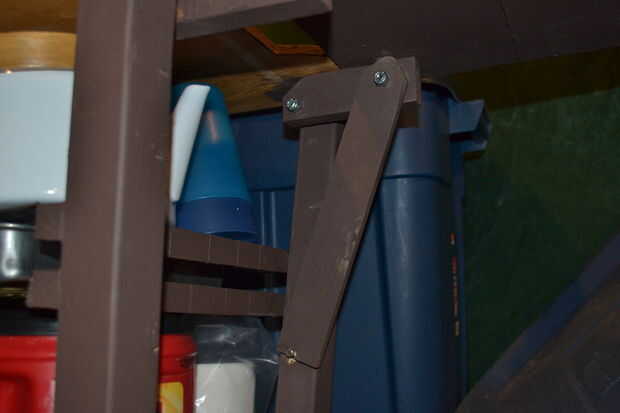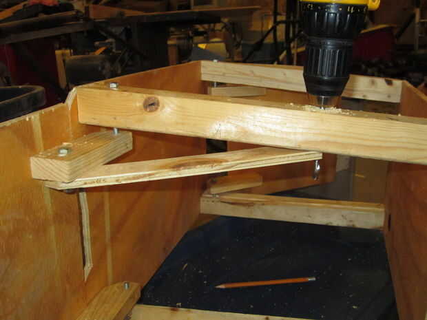 El puntal de estante se emperna al agujero en el extremo cuadrado de la bisagra. Al final tiene una pequeña muesca semicircular para mantenerlo en la cola de tornillo que pasa a través de los estilos. Para apuntalar la plataforma, el extremo de la cincha es girado hacia abajo y apoyado en el extremo del perno. Tengo jale hacia arriba el extremo del estante un poco para que sea fácil de mover el puntal. Esto es ideal para que accidentalmente no salen. Empuja el estante duro marcado y había perforado el agujero para el tornillo en el estilo.