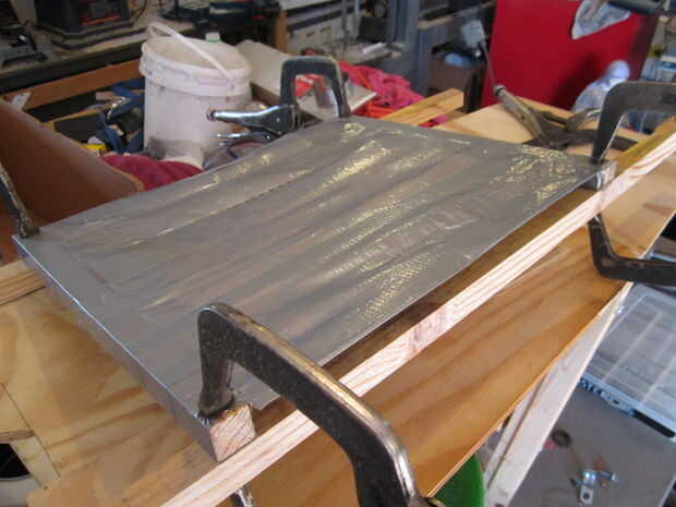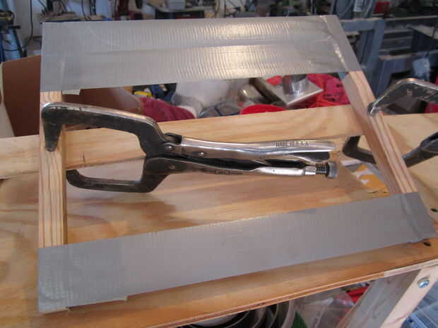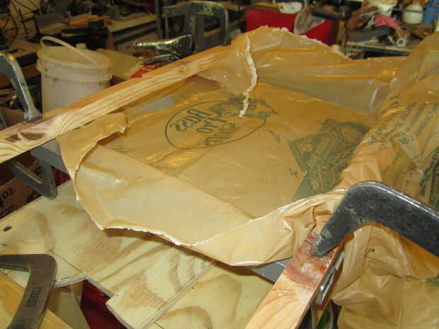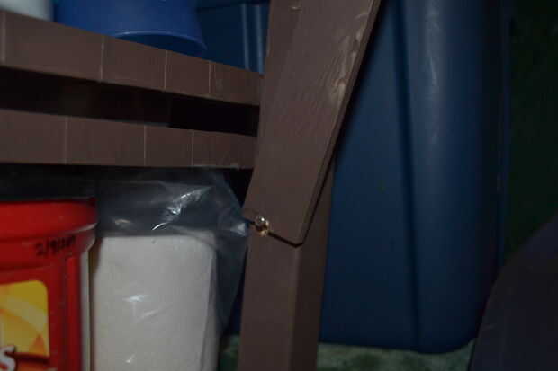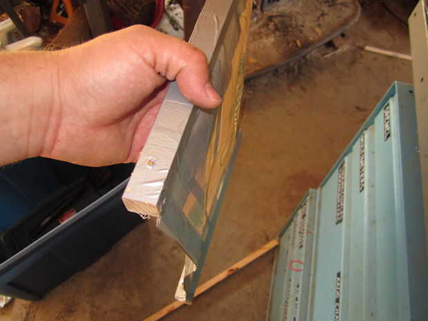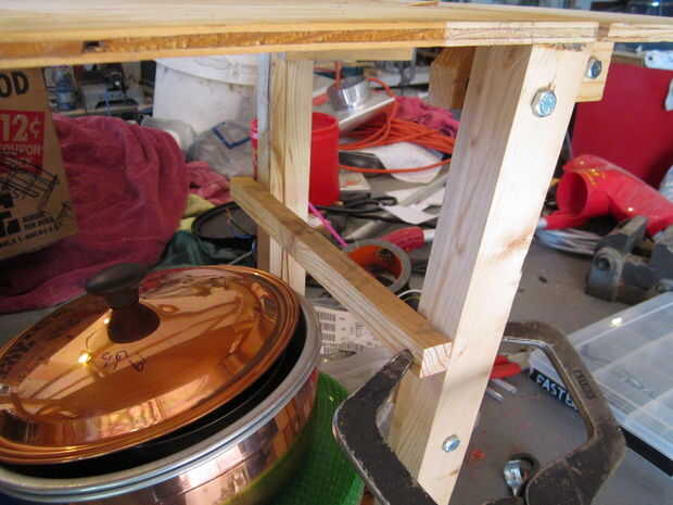 Quería algunos estantes ultra delgada, peso ligero. Uno de ellos soporta ollas, tazas y otras cosas, y uno apoya la bandeja cajón/de la hornada de utensilio. Tengo toda la buena voluntad cocina suministros en una pila y planeó cómo alto quería mis estanterías. Entonces medí la distancia entre los estilos a altura y corte un par de 3/4 cuadrados por 11-1/2" largo varillas. Sujeta las varillas paralelas entre sí con algunos restos de madera la misma distancia aparte como mis estilos menos 1/8". Luego puse cinta de un estilo a lo otros envolviendo la cinta de nuevo en sí mismo unos 2". Entonces pegué una sola capa del bolso de compras plástico viejo a la cinta adhesiva para evitar que se pegue a mis cosas. Esto hizo que una plataforma web fino para apoyar cosas.