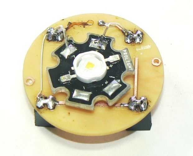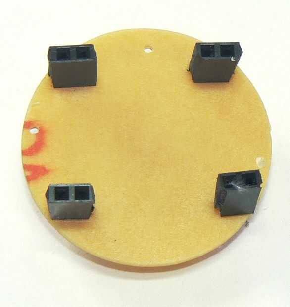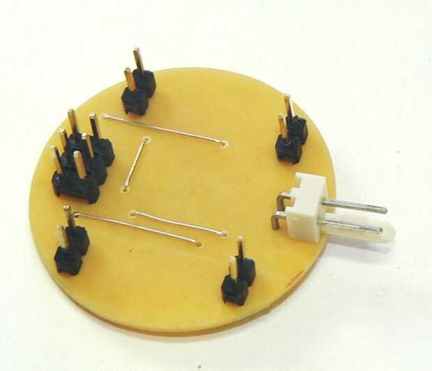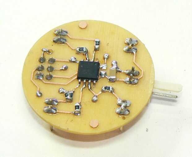 Soldar todos los componentes como se ve en las fotografías. Distribuyendo el circuito en dos tablas, una para el controlador y otro para el LED no sólo es útiles para reducir el diámetro de la Junta sino también para asegurar que cuando la tarjeta controladora se programa a través del conectador de la ISP (desconectando primero el tablero LED de la tarjeta controladora), el LED no carga las señales de la ISP.
