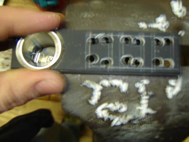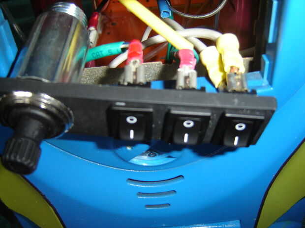Cortando la placa disquete involucrados perforar algunos agujeros en cada esquina de donde estaban los interruptores, que me dio un punto de partida para cortar con el Dremel y los interruptores apenas encájese a presión en. Entonces son cableados y prensados en con fast-on.