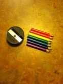 Luego encontrar algunos pequeños lápices o bolígrafos y un sacapuntas (si está usando lápices) y los tiro en demasiado.