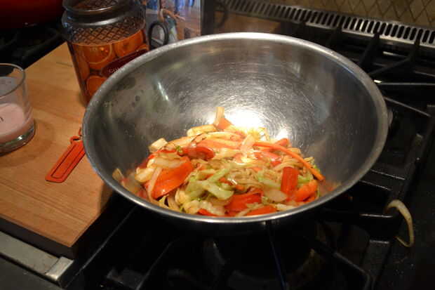 Primero quiere poner 1 cucharada de aceite en la sartén y calienta hasta la temperatura adecuada. Ahora desea agregar la zanahoria, la cebolla y el pimiento. No la col ya que cocina más rápido. Después de que la cebolla comience a obtener este tipo de efecto que brilla intensamente y los pimientos están recibiendo clase de naranja su listo para el repollo. Poner en las 2 tazas de col y revuelve durante 2-3 minutos. Ahora, pones las verduras cocidas en un recipiente para dejar a un lado.