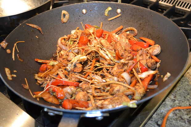 Una cena encantadora Wok con pollo marinado y 2 verduras de nuestra huerta