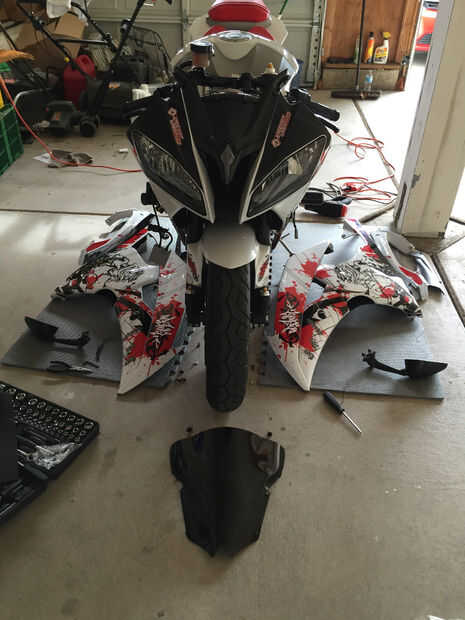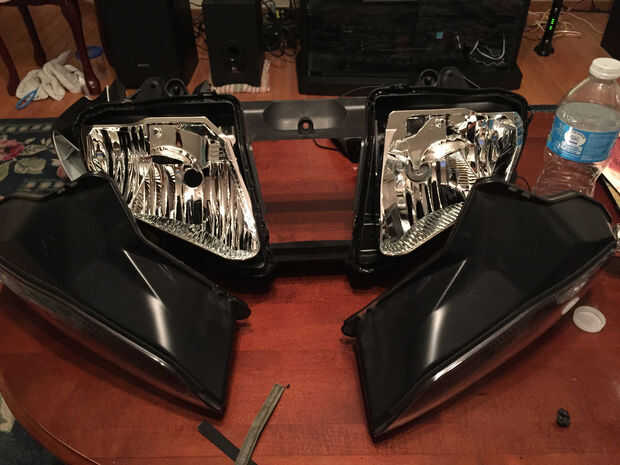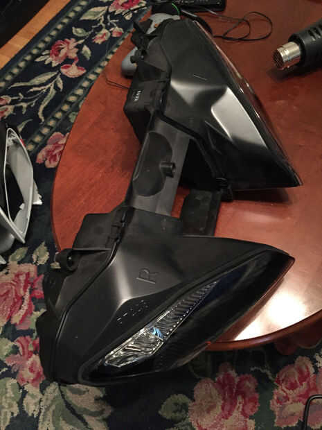 La primera cosa a hacer es desconectar el terminal negativo de la batería. Luego retire los capotajes de ambos lados y ponerlos en lugar seguro. Esto debería ser bastante fácil y sólo toma minutos si lo has hecho antes y sabe su manera alrededor de la bicicleta. A continuación retirar el parabrisas delantero, espejos y carenado, su todo muy directo para quitar y como hacer un seguimiento de sus piezas será fácil volver a poner. Después de hacer todo lo que podrá retirar la carcasa del faro sin nada en su camino. Una vez quitado uso una pistola de calor para separar la carcasa del faro en dos mitades como se muestra.