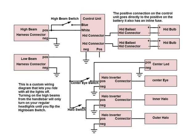 El cableado es muy simple de hacer las conexiones de la soldadura y enrutamiento de los cables limpiamente tarda, he incluido un diagrama de cableado personalizado que muestra mi setup. He añadido 3 interruptores para encender independientemente en diferentes partes de la linterna. Decidí instalar los interruptores en el panel pequeño cerca de la frontal por lo que están algo escondidas, pero fácilmente accesible. Esta moto ha sido atada con alambre puede ejecutar tendrá todas las luces de fuera, sin embargo encender los faros todo lo que tienes que hacer es girar el interruptor de luz de carretera la barra. Para activar la alta vigas o diferentes partes de la linterna se utilizan los 3 interruptores.
