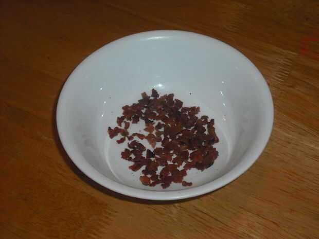 Primero necesitas tocino, así que ir adelante y fríala por si no lo has hecho ya. Supongo que ya sabes cómo, y si no me recomiendan un libro de cocina y un psiquiatra. Una vez hecho esto, (mmm... huele bien ya) deje enfriar un poco y triturar en pequeños trozos. El tamaño no tiene que ser demasiado preciso, pero ninguno de mis fragmentos de bacon era mucho más que un centímetro en longitud.