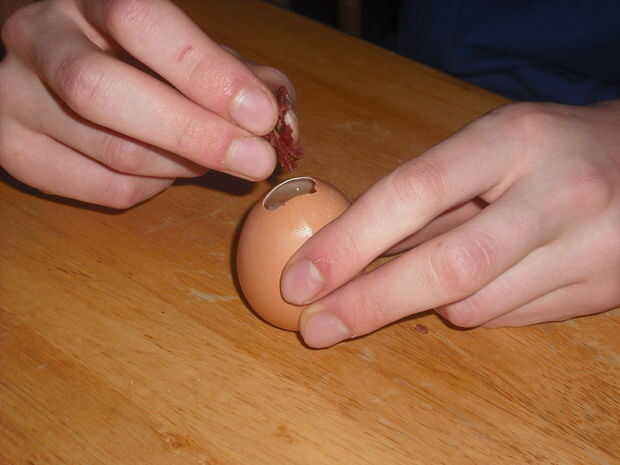 Casi! Este paso es fácil como se puede imaginar, mientras no caiga el huevo, va a estar bien. Acaba de poner el tocino desmenuzado en el huevo. Después de toda la obra de bacon está dentro, suscitar con su elegido revolviendo implementar.