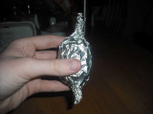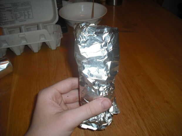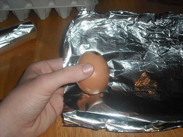 Ahora, usted podría tomar el huevo como es y plop en agua hirviendo, pero se escape durante la cocción y no queremos eso, ahora le? Hmmmmmm... ¡Lo sé! Envolver el huevo en papel de aluminio! La demostración de los cuadros mejor que te puedo decir, así que consultar para envolver la técnica. Tratar de no llegar a mucho aire entre el papel de aluminio y el huevo.