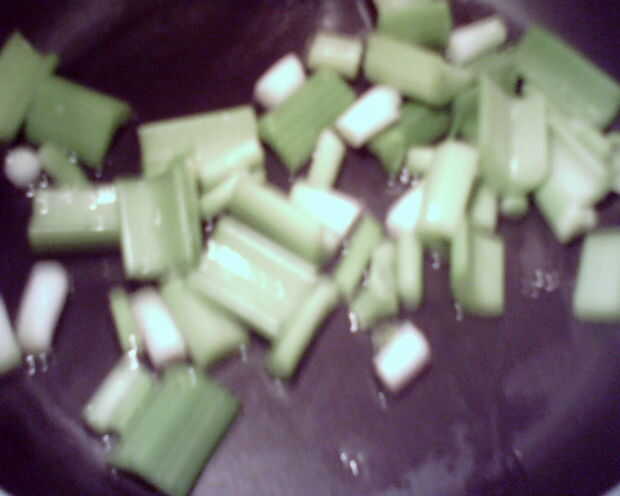 Revuelva freír cebolla de verdeo y el apio en el aceite durante 1 minuto.