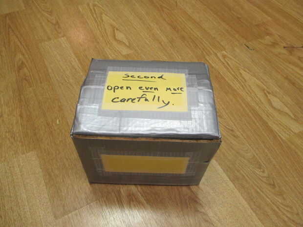 En este punto realmente me estaba gustando la envoltura de cinta del conducto, como su esquema de color se presta muy bien a lo que parece una real caja de clavos. Tomó que un paso más e incluso ha añadido el papel amarillo para que parezca las etiquetas de cajas de uñas.