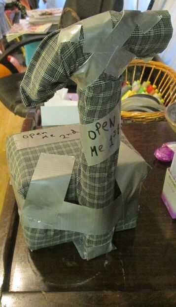 Yo no podía ayudar pero lleva la idea a su conclusión lógica y hacer un envoltorio final no con papel gay de la Navidad, pero la camisa de un hombre y más cinta. Me pareció bastante divertido. Y luego sharpie como quería que abrir primero el martillo y la caja de clavos en segundo lugar. ¿Por qué? Porque como ridículo como regalo #1, regalo #2 realmente eliminado lo de la par... queculo Junta. (¡ lo siento!)