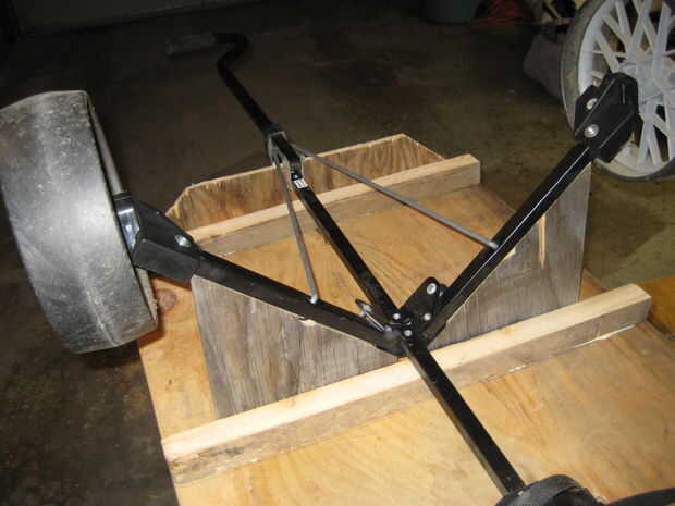 Para el tirante frontal es ancho y está pegado y atornillado al soporte de 2 x 2. Determina la ubicación y la profundidad de la ranura necesaria para asiento hacia abajo sobre el carro de golf soporte y recortar con una sierra de calar.