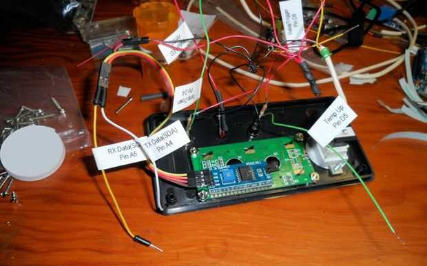 Para las conexiones al controlador LCD, he utilizado cables de puente de la mujer, mujer, que están conectados en pares. Dos parejas hacen un zócalo muy agradable para enganchar en los pasadores del conductor. Un rojo y un cable negro, cada uno conectados a los puentes f/f para fuente de + 5v y tierra para el conductor del LCD. Dos puentes/macho enchufe los conectores de f/f de datos TX y DX a los pines de Arduino A0 y A1. [Como una ocurrencia tardía, podría han usé otro de los conectores de cable de alimentación de PC, como en la cola del interruptor de potencia paso.]