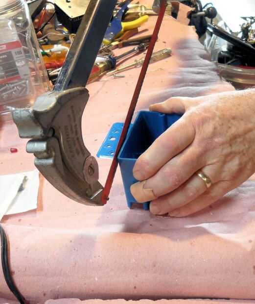 La carcasa es una caja de salida simple de "Nuevo trabajo". Es mucho más barato que una caja del proyecto y facilitan el trabajo, ya que está hecha para aceptar una toma de corriente. Corte el montaje. Taladre los agujeros para el ojal del cable de alimentación y el estéreo. Montar al jack con su conector asociado para el relé. Presionar la arandela en su agujero y alimentar el cable de alimentación a través del ojal. El lado caliente de un cable de alimentación sin colores será suave. El conductor neutro tendrá las costillas. Si hay colores, el negro estará caliente y el blanco neutro. Conectar el cable vivo al terminal común del relé. Conecte un cable desde el relé (normalmente abierto) NO terminal en el lado caliente (color latón tornillos) del receptáculo de salida de energía. Conecte el cable neutro al neutro lado del receptáculo de salida de potencia (tornillos en color plata). Conecte el cable de cable verde al tornillo verde (tierra).