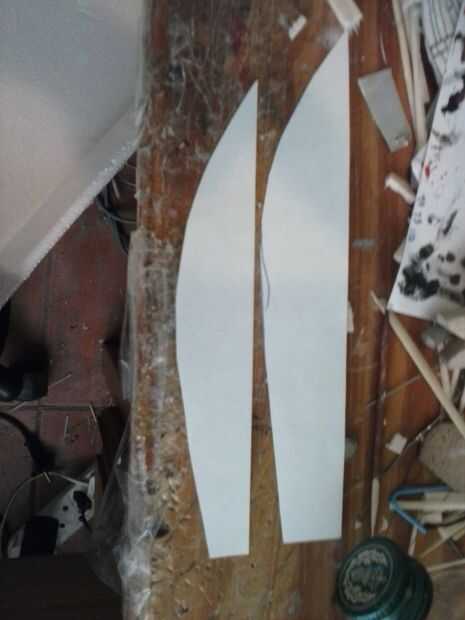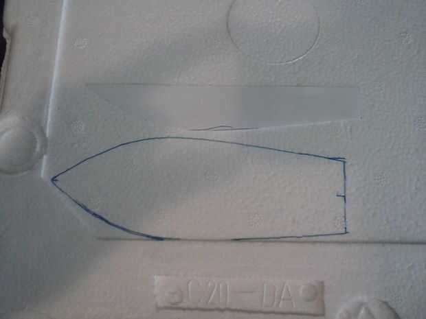 Hay 2 dibujos en el plan para las 2 capas de espuma. (Si sólo está usando una capa de espuma gruesa entonces lo mejor que te puedo decir que es uso las imágenes de referencia). Trazar las 2 plantillas sobre la espuma, luego cortar hacia fuera solamente en el contorno. Biselar los bordes de las 2 capas para que el menor hace una forma de "V" mientras que el más grande hace forma de "U". En el plan, son plantillas/dibujos de debajo para que pueda ver dónde los dos extremos de los cartabones se debe, desde la parte superior (fuera de línea) a la parte inferior (en línea). Esto suena complicado pero es muy sencillo de hacer, dibujar el menor desde el plan sobre la espuma y corte del contorno de una a la otra (Eg. azul línea a línea roja) y la conformación de las capas debe hacerse.