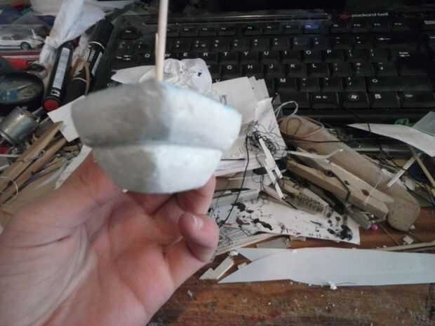 Meter 2 palillos de dientes a través de las dos capas pero primero asegúrese de que estén alineados y simétrica. Tallar y recortar la espuma un poco para que la capa superior e inferior se encuentran muy bien. [Ver las 2 últimas imágenes de este paso]