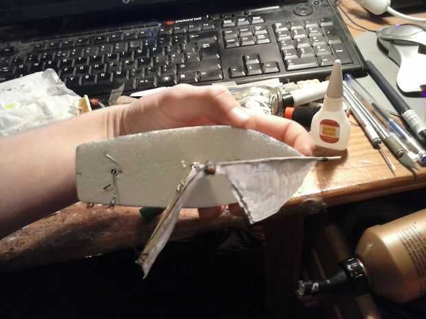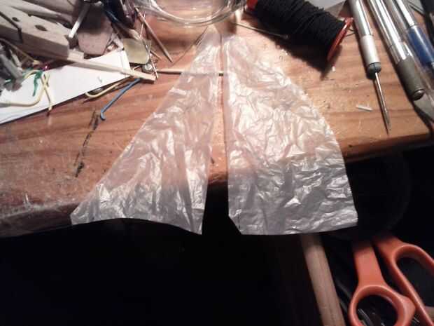 Para la pluma, poner pegamento en los bordes más 2 de la vela y coloque el borde delantero en el estay de proa. Tire de la parte inferior del hilo detrás del estay de proa para que sea enseñado, luego que el borde posterior de la pluma (y el pegamento en él) en contacto con este hilo. La parte que toca la vela debe ser recta, pero la parte del hilo de rosca debajo de la vela debe tener holgura en el mismo. Envuelva el borde más delantera de la vela alrededor del estay de proa y el borde de la parte posterior más alrededor de la cadena posterior.