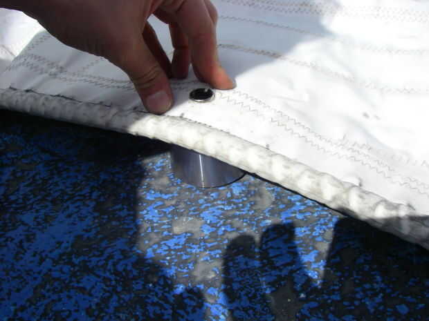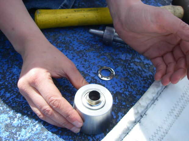 Estirar el orificio de la vela sobre el ojal y empújela hacia abajo alrededor de la boquilla.