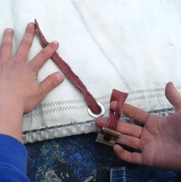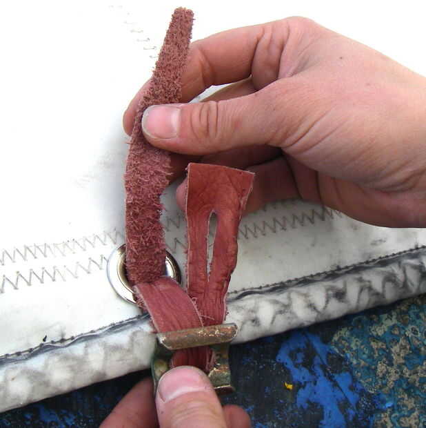 Comienza como se muestra, a continuación, inserte el extremo puntiagudo a través del coche otra vez, repasando la correa ya allí y en los alrededores a través del ojal otra vez.