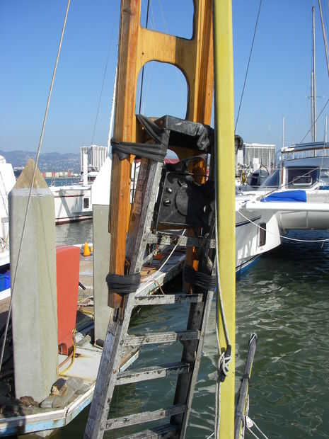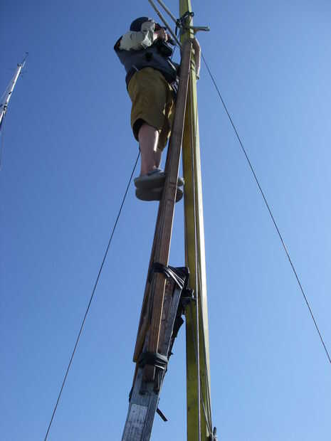 Cuando inclina el mástil hacia atrás descansará en este soporte. Primero necesitamos una escalera encima de la Mesana. No tenemos una escalera lo suficientemente larga para el latigazo de un par de escaleras junto con la cámara.