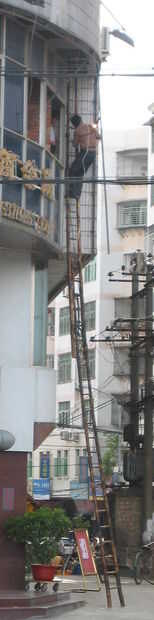 Si deseas esta foto disparé en la ciudad de Putien, provincia China de Fujian. Tres escaleras de bambú juntos azotado por lo que un chico puede soldar sobre su cabeza con una mano colgando de.