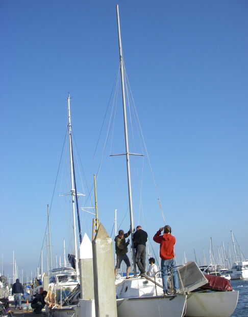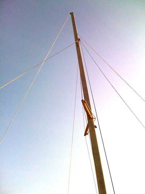 La driza "estancias" mantenerla para que podamos mantener la holgura de acero estancias y trabajar en la fijación al casco. Como puede ver en la foto 2, hay seis líneas sostienen el mástil. Las líneas exteriores son los tres drizas que realmente mantener el mástil. Los tres interiores son los tirantes de cable de acero inoxidable que son flojos, por lo que podemos trabajar en ellos. También hay dos estancias de diamante, uno a cada lado del mástil. Que giran con el mástil y no necesitan ningún trabajo adicional o ajuste.