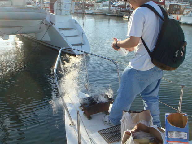 Algunas personas empezaron a asar verduras para arriba en la proa del barco.