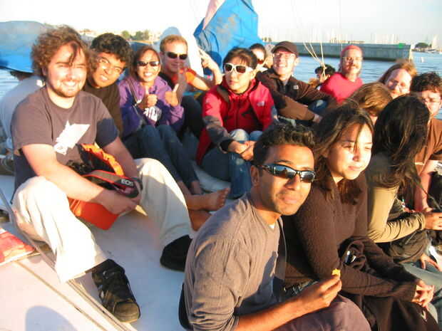 Poco tiempo había un montón de gente feliz a bordo. Es un barco enorme, 18 pies de ancho, aparentemente sobre el tamaño de una pista de tenis cubierta. Nuestras líneas de flotación sólo consiguieran hacia abajo una pulgada o dos. El barco consiguió más estable como los estabilizadores grandes vee-casco tiene más líneas de agua.