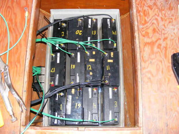 son todos por cable en paralelo para hacer 12V, 200Ah. El bloque de cableado he encontrado en la pila de desecho de un electricista comercial.