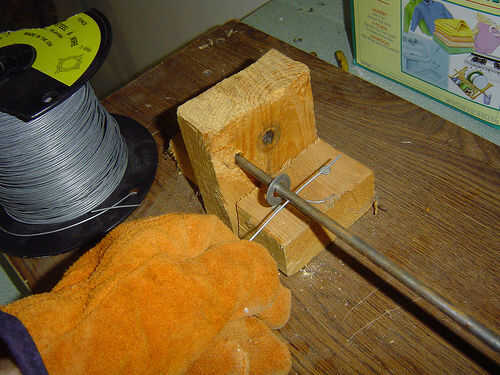 Una nota rápida: Estas fotos fueron tomadas unos años después dejé de hacerlo chainmaille mucho, mi 3/8" varilla de bobina había desaparecido. Sustituye con una vara más pequeña bobina. También, no pude encontrar todos los de mi lavadora, así que sólo tengo una arandela en los cuadros. Normalmente, deseará tener unas arandelas más que en la foto, aunque una sola lavadora funcionará. También, no pude encontrar la herramienta bobina de latón ya. Los pasos siguientes describen la bobinas de alambre sin la herramienta bobina del viento.