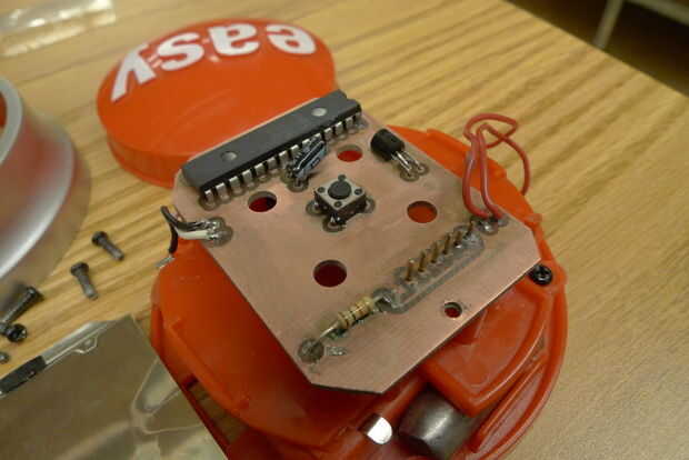 La soldadura de la placa (no necesitas programar nada primero a menos que no planea instalar R1, en cuyo caso usted debe dejar de R1 hasta que usted haya programado el chip). Como de costumbre instalar los componentes pasivos (resistor, condensador, interruptor) en primer lugar, entonces los pequeños componentes activos (transistores) y por último el microcontrolador pasado. Observe que el transistor y el capacitor tienen que ser doblado hacia abajo para caber en la caja, dejar lo suficiente de la iniciativa para permitir que la curva.