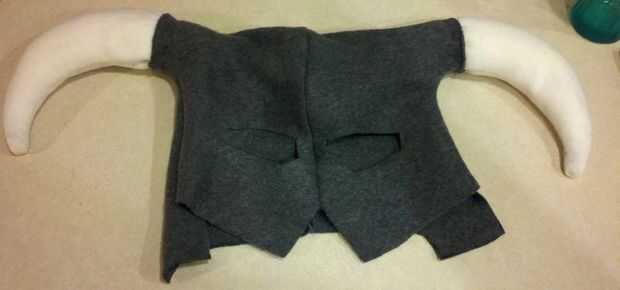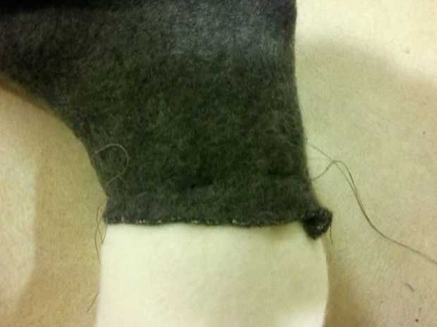 A partir de la parte inferior, de mano cosió los cuernos con el hilo gris oscuro. Dando vueltas en un círculo cada tan a menudo sólo para garantizar el cuerno en su lugar. También puse unas puntadas en la parte superior cerca de la base del cuerno.