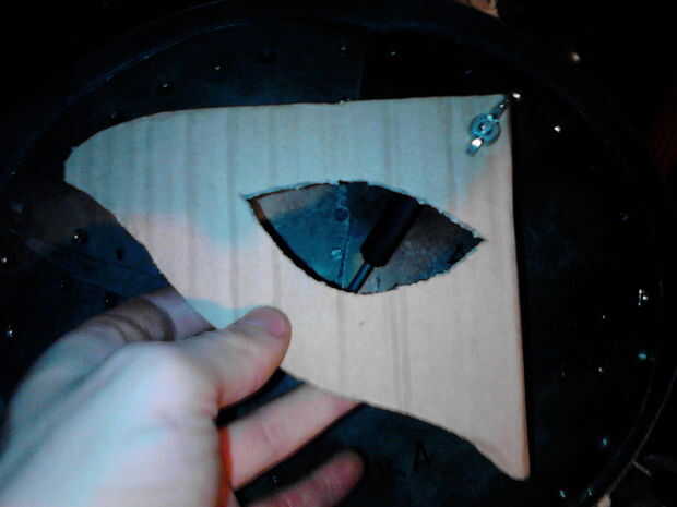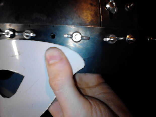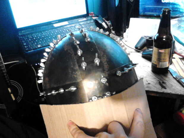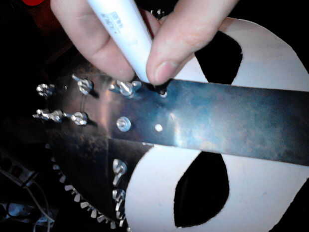 Tiempo para hacer el helm infundir miedo en sus enemigos! Para obtener los minoritarios iniciado tiene su marco y paneles atornillan y colocar algunos ontop de cartón para obtener una estimación aproximada de la anchura. Doblar este pedazo de cartón por la mitad al centro, marca esto y colocar otra marca a 2cm del borde (imágenes 1, 2 y 3). Ahora realice marcas cuales el borde a una distancia de 2cm (Figura 4). Saque los dos tornillos delanteros inferiores y colocar el cartón para la marca cae entre los dos extremos de la banda de circunferencia y todas las marcas de 2 cm en el borde de la banda. Perfore el cartón a través de los agujeros y el perno en la cabeza entre la parte posterior al frente y la banda de circunferencia (cuadros 5, 6 y 7), puede mantener el carboad en su lugar usando algunos imanes para mantener las esquinas hacia abajo.