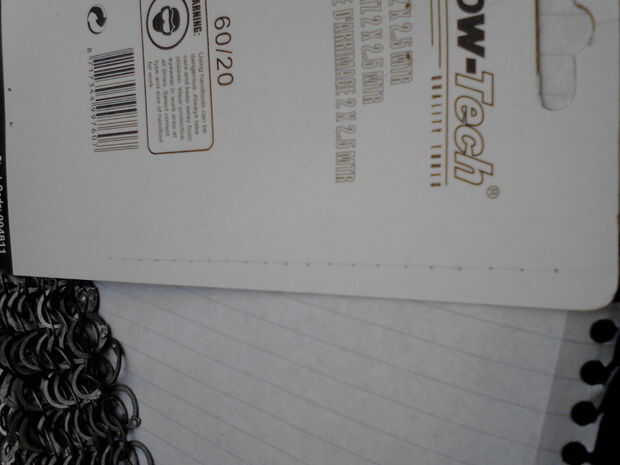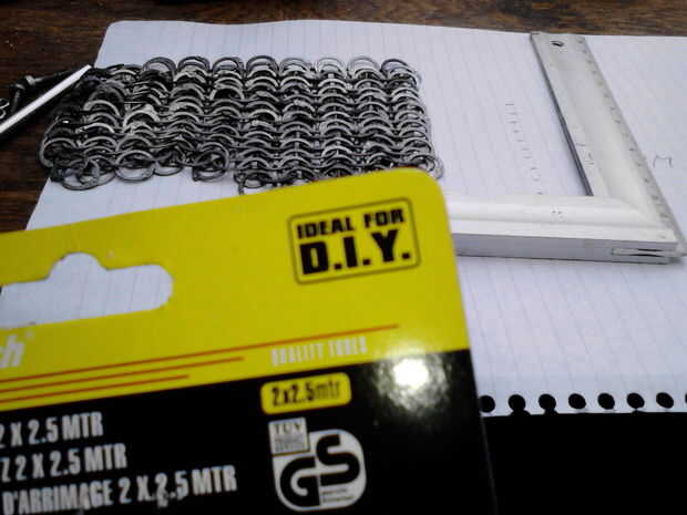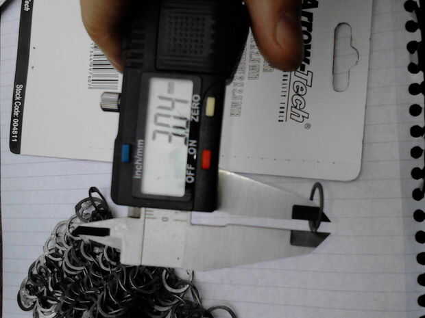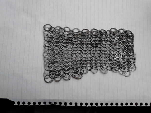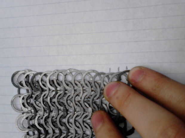 Comenzar hacia fuera haciendo un pedazo de chainmaille, no necesita hacer la cosa entera todavía. Tomar un trozo de papel y poner el chainmaille ontop. Asegúrese de que la maille está en "reposo" posición, lo que significa que no está estirado. Tomar un bolígrafo / lápiz y poner algunas marcas en la parte superior de cada anillo. Estas marcas de medir y calcular la distancia promedio entre las marcas.