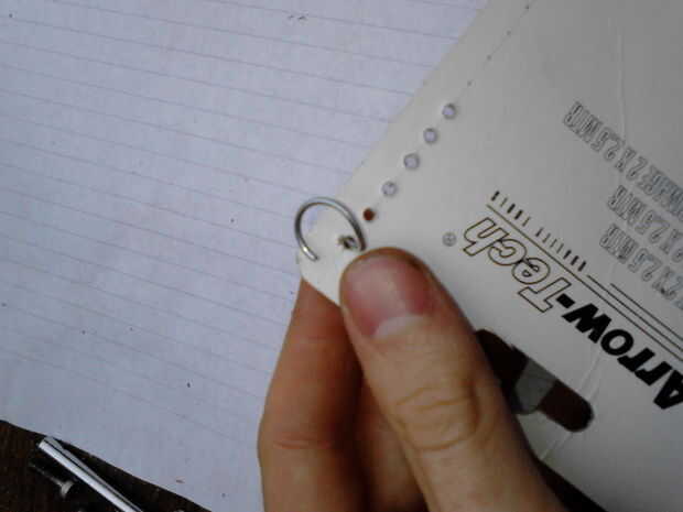 Tomar este medio y el radio de sus anillos (diámetro / 2) y coloque marcas en un pedazo de cartón en 1 x el radio del borde y 1 x la media entre ellos. Ahora usted tiene una buena plantilla para marcar donde deben ir los agujeros para el chainmaille.
