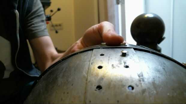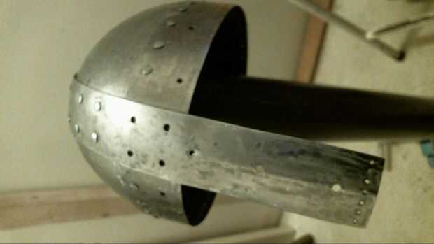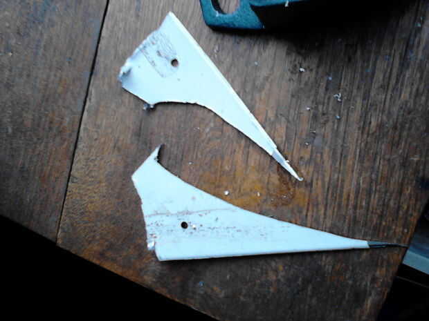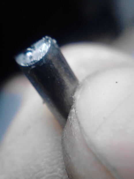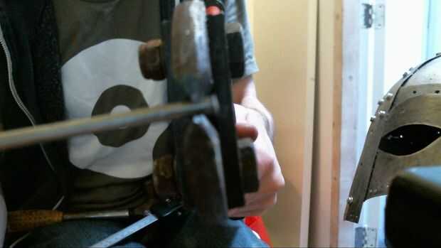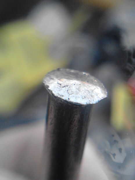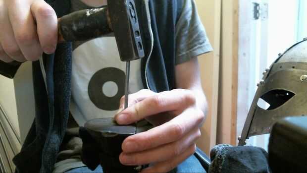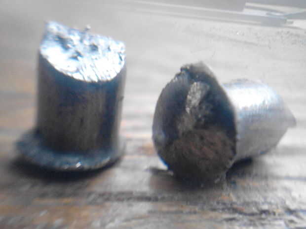 Cuando tienes un remache hecho, tomar tus pedazos de desecho y empuja el remache a través de tomar que sobre su yunque y de la seta hacia fuera el remache con su ballpeenhammer hasta el testpieces se pegan juntas! Cuando esté satisfecho con el resultado puede ir a clavar el timón. Asegúrese de que el remache no ejerce a mucha presión hacia los lados en el metal, lo que significa que el remache no debe ser demasiado en el medio.