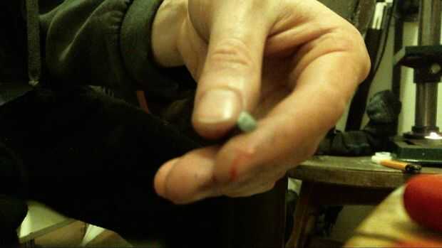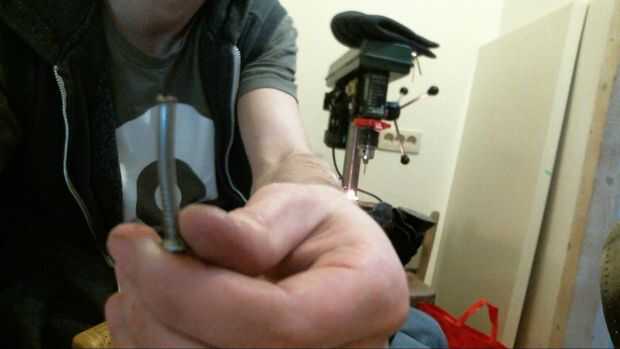 Ahora que tiene una forma completamente, lijada y encerada caña su tiempo para reemplazar los tornillos con remaches! Pero permite hacer primero una pieza de ensayo, toma 2 piezas de chatarra (mismo espesor) y algunos agujeros (el mismo ancho que tus uñas grandes).