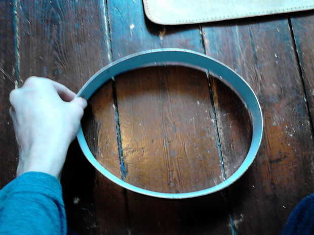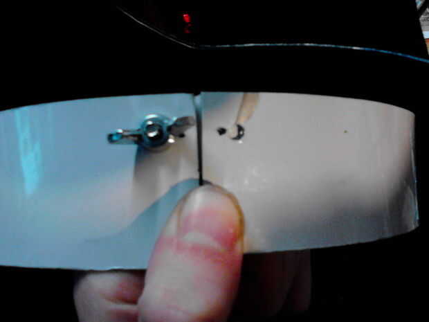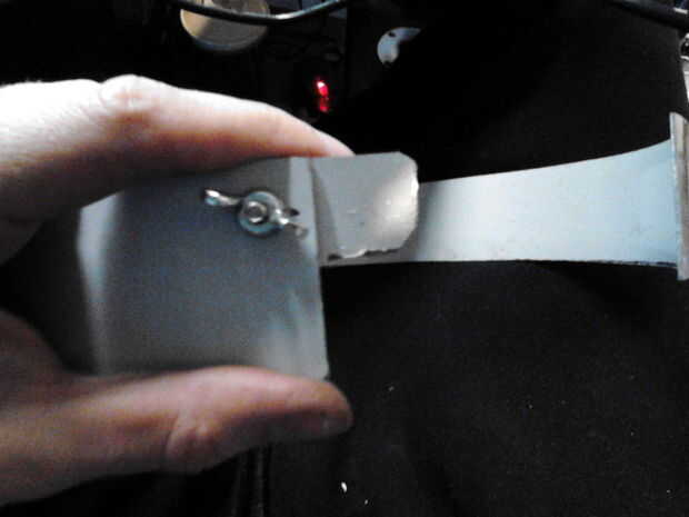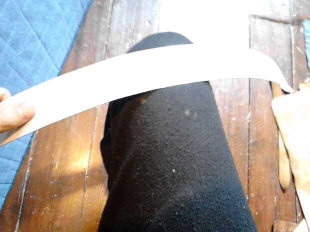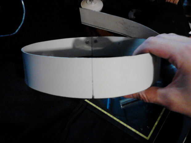Las bandas de flexión realiza colocándola simplemente sobre la rodilla y doblarla poco a poco. Cuando tienes la circunferencia de la banda bent use su marcador permanente para marcar, punzón y perfore un orificio de 1cm de ambos bordes (cuadro 6). A continuación tomó un trozo de chatarra y perforó un agujero en ella y atornillados a la banda. Luego presionando la banda juntos, marcado y perforar un segundo agujero en la pieza de chatarra. Esto me permitió conectar la banda circunferencia a sí mismo (cuadros 8, 9, 10, 11 y 12).
