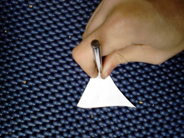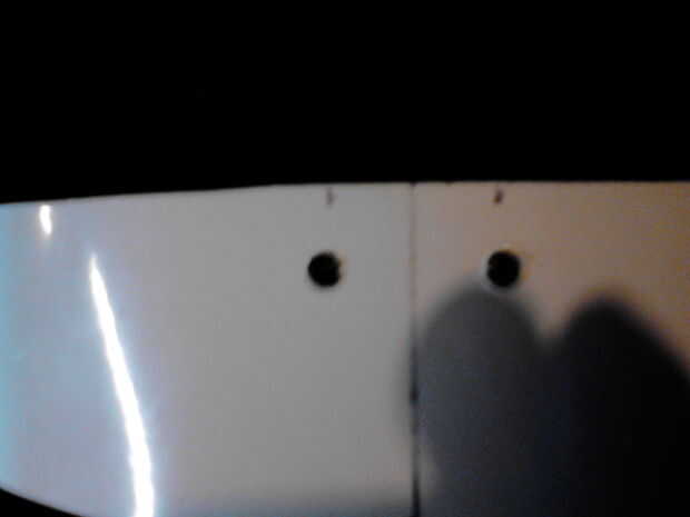 Luego marque el centro de la banda en la parte trasera marca dos puntos, como antes, 1cm de cada borde y perforar estas (fotos 13, 14 y 15).