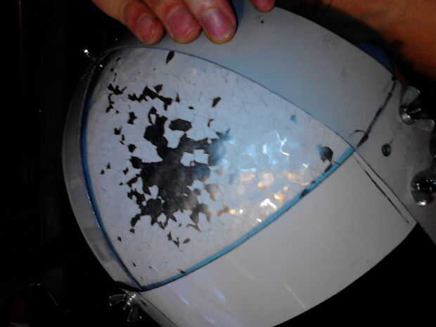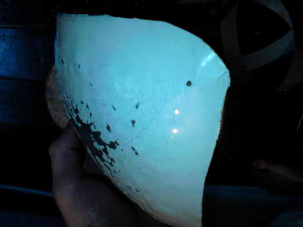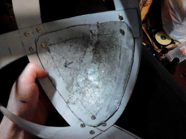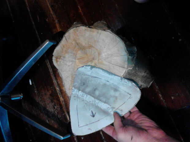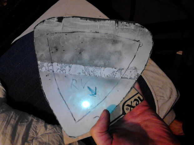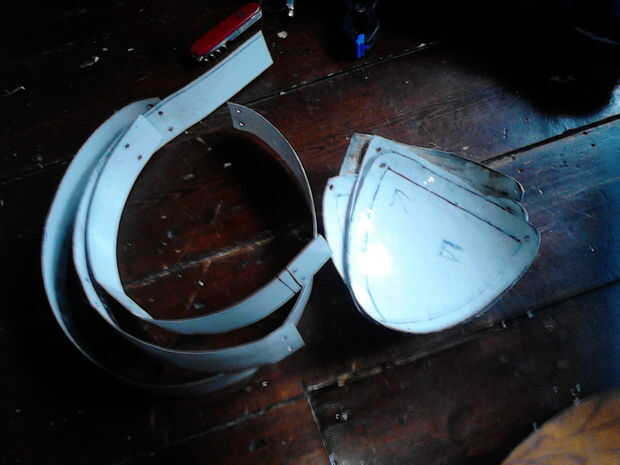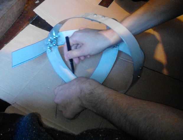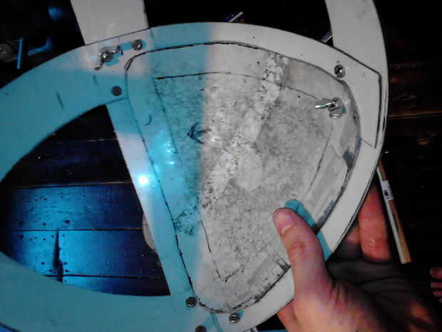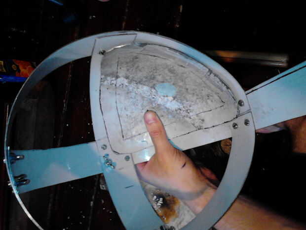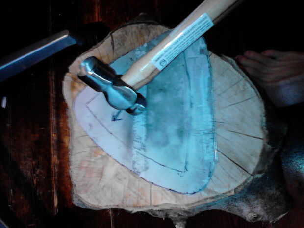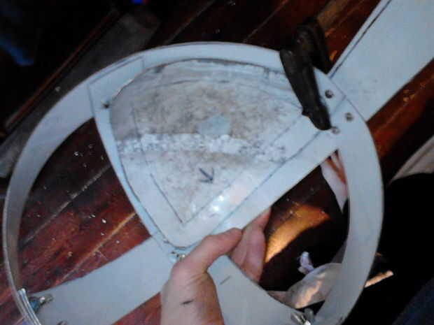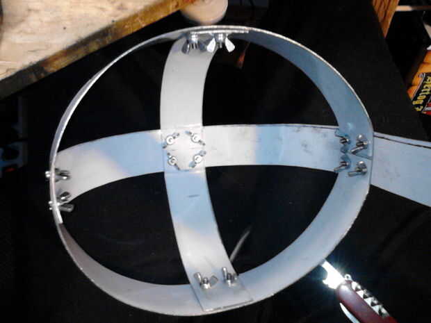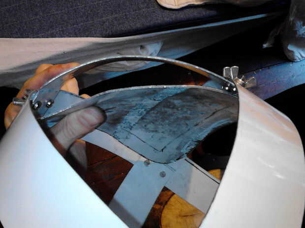 Tome su panel recién cortada sobre su muñón dishing y comenzar otros lejos en él con el martillo dishing, comenzando desde el centro y su forma de trabajo hacia fuera hacia los bordes. Al empezar a obtener un poco de forma de plato (foto 15) tomar los tuercas y tornillos fuera de su marco y lugar con las tuercas de mariposa en el exterior otra vez. Coloque el panel cóncavo dentro de su marco y controlar cuales partes necesitan más dishing (fotos 16 y 17). Seguir haciendo esto hasta el interior del marco quede al ras con el panel (Figura 18). No te preocupes si el exterior del marco coincide perfectamente como no más de unos pocos mm, será coldsmithed hacia abajo más tarde.