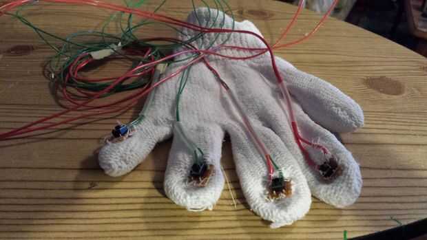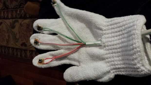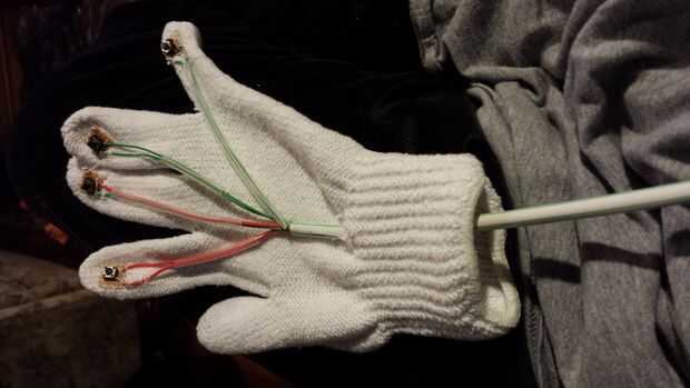 2. Tomar los cables restantes con sus botones y coser en la punta de los dedos del guante zurdo.