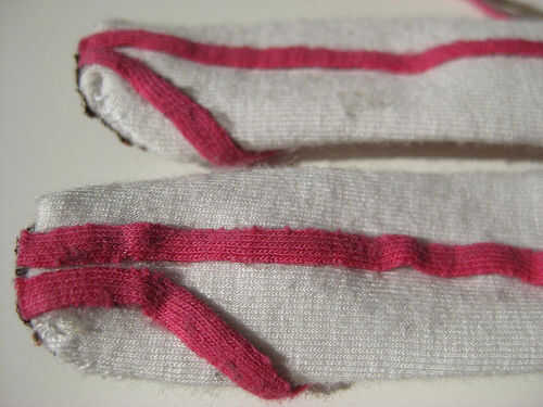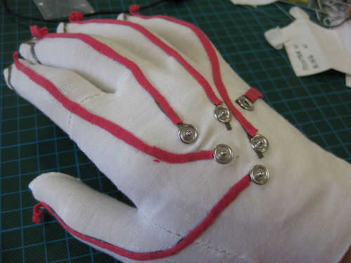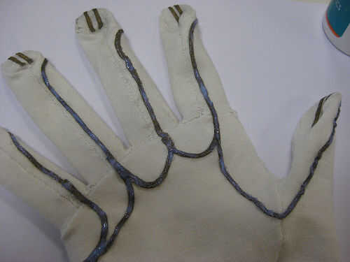 Sacar el pegamento de tela elástica y aplicarlo aproximadamente 1mm de espesor y uniformemente a los rastros conductores. Hace sentido hacer un lado a la vez. Esperar a que el pegamento se seque durante unos 10-15 minutos (cuando se ha ido el brillo azulado) antes de añadir las tiras de tela, de lo contrario la cola se filtrará a través de la tela.