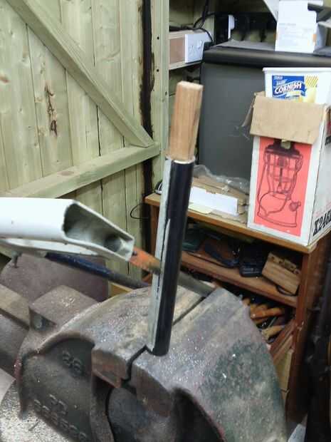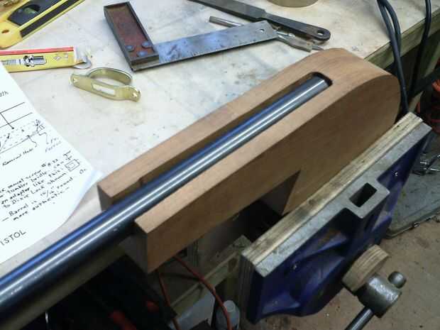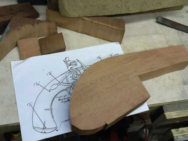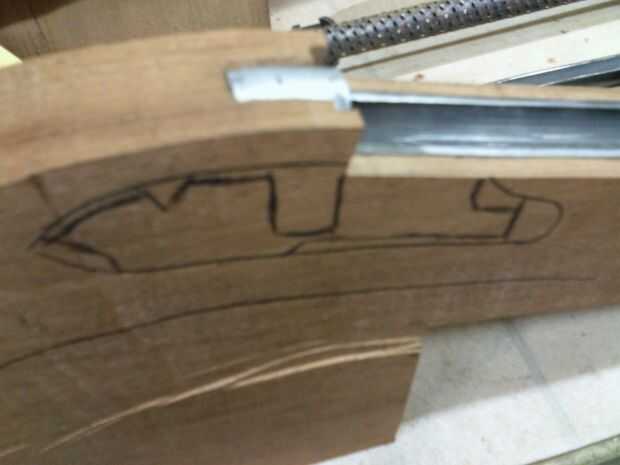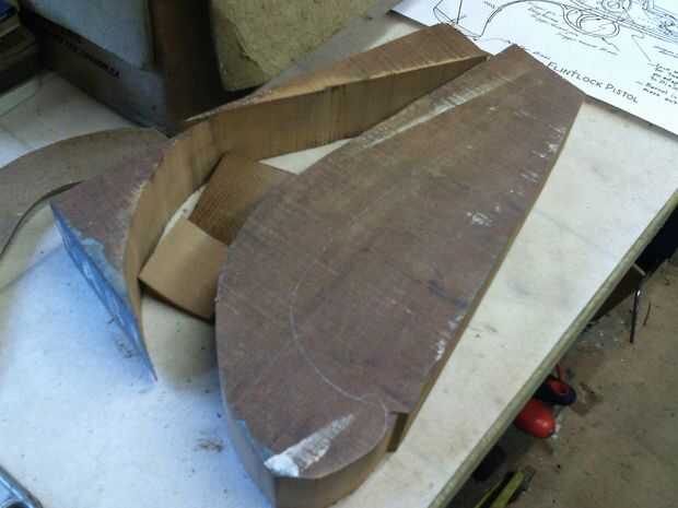 La pieza de caoba fue cortada a un contorno áspero con el rompecabezas de que la ranura se corta con un router para el cañón para montar. la madera era de 50mm de espesor y había adelgazado abajo con el plano de energía ángulo ambos lados para que la pieza de la manija terminó menor donde encaja el barril. También bosquejó la posición de la cerradura.