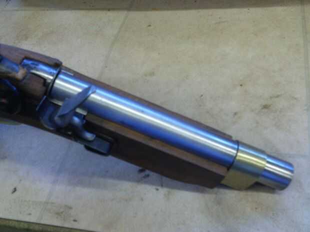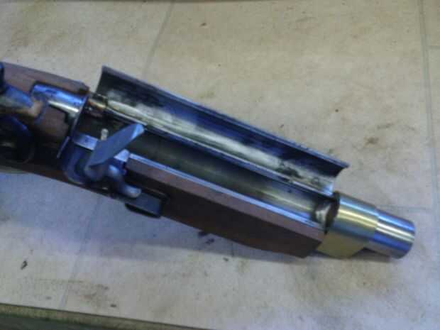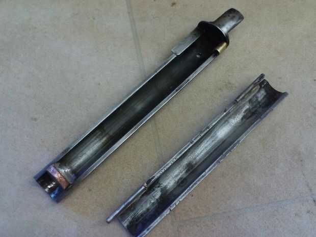 La mitad superior del cañón se presentó en cada extremo para tomar un trozo de alambre de piano de diámetro 3mm para la bisagra que eran plata soldada en su lugar